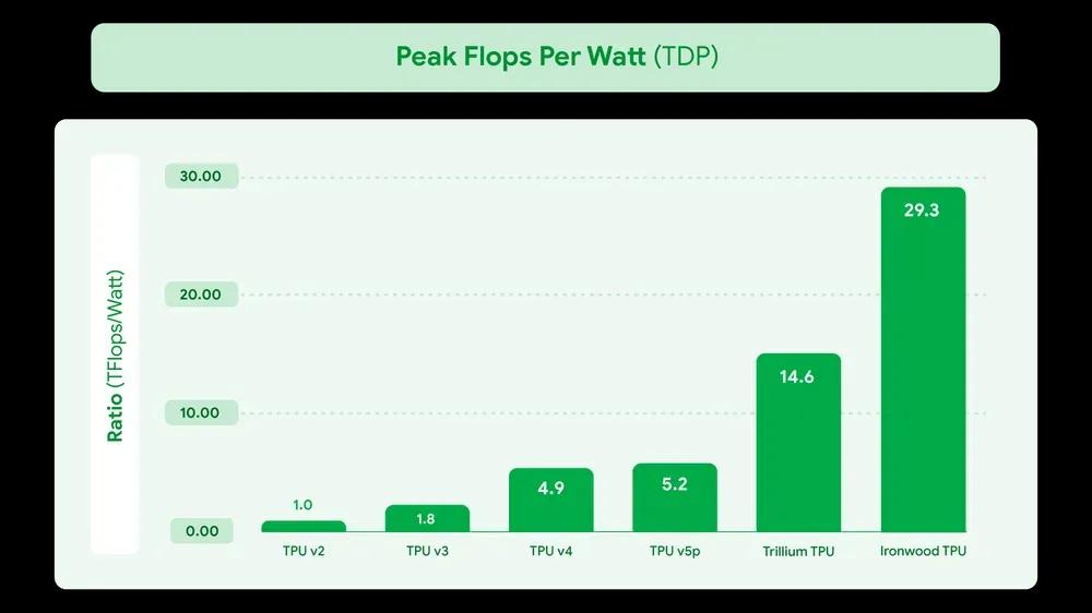 Ironwood的能源效率也实现了一次飞跃。相比去年发布的第六代TPU“Trillium”(延龄草),Ironwood的性能功耗比提升了两倍,通过先进的液冷解决方案与优化的芯片设计,Ironwood在持续高强度的AI工作负载下,性能可达标准风冷的两倍,相比2018年的首款云TPU,能效提升近30倍。