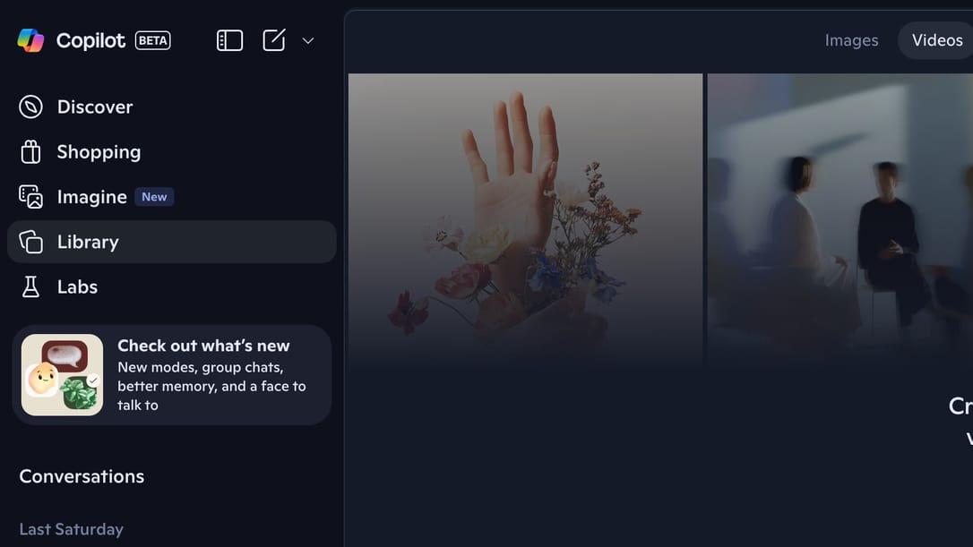 最新迹象显示,Copilot 网页版的库(Library)界面中出现了一个新的“视频(Videos)”标签页,用户生成的视频将在这里集中存放和管理,类似于现有的图片存储方式。专门用于图片生成的 Imagine 页面也可能将视频展示整合其中,实现图像与视频的一体化操作体验。