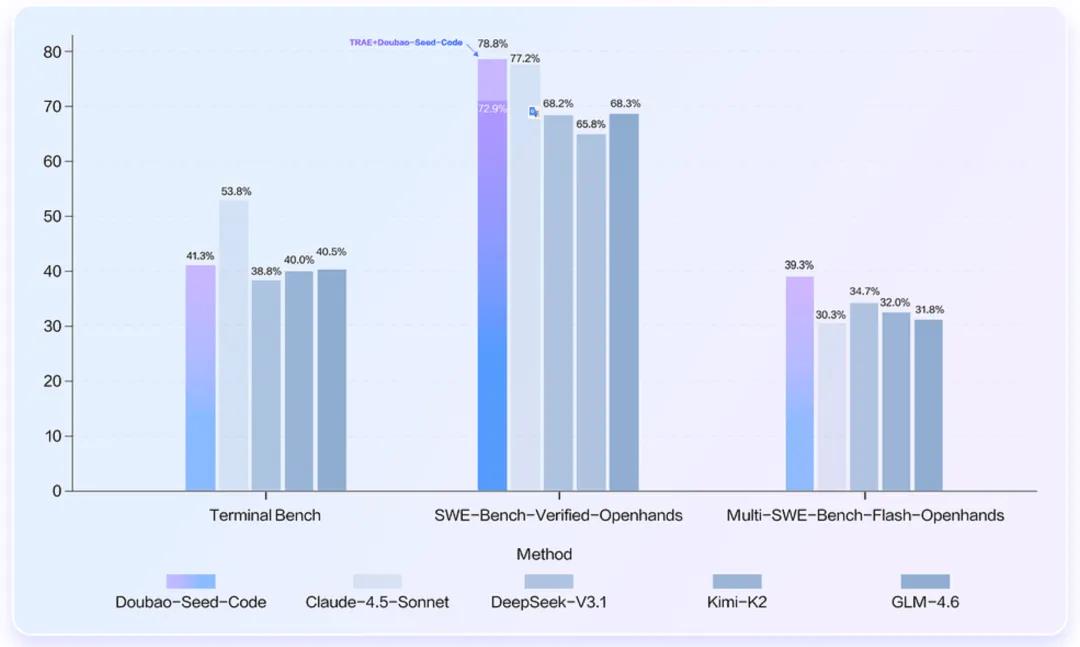 根据官方数据显示,Doubao Seed Code 在 SWE-Bench-Verified-Openhands 和 Multi-SWE-Bench-Flash-Openhands 等测试中成绩领先,甚至在部分指标上超越了 Sonnet 4.5,仅在 Terminal Bench 上略逊一筹。