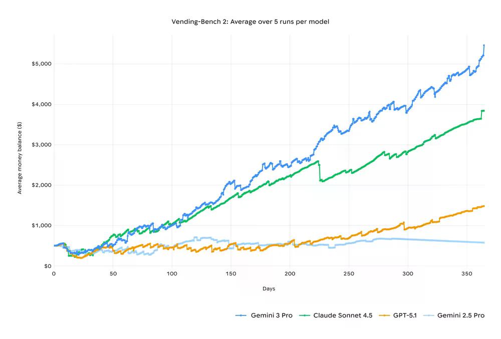 Gemini 3 在长期规划方面也有显著进展。它能在模拟经营场景中维持稳定判断,不偏题不跑偏,也能在现实应用中处理更复杂的多步骤任务,比如自动整理邮箱或安排服务预约。