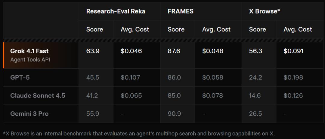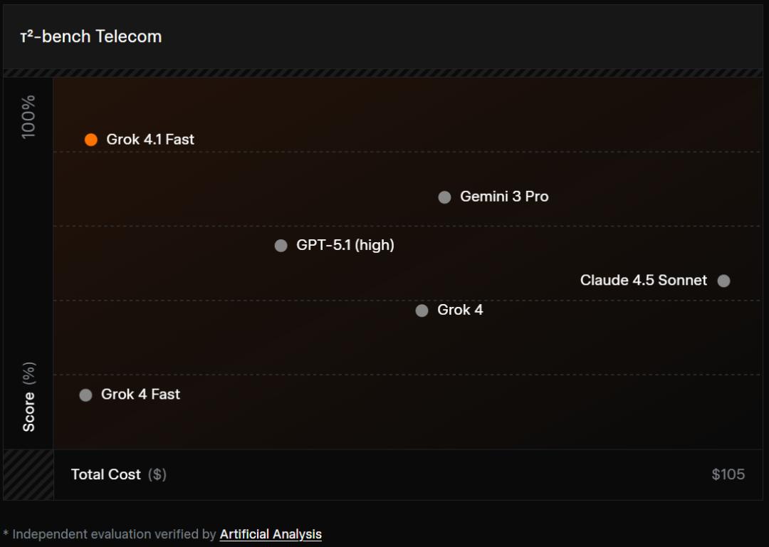 Grok 4.1 Fast 被定位为 xAI 目前最强的工具调用版本,支持 200 万上下文,处理任务的速度和准确度相比之前有明显提升,尤其是客服、金融等对响应质量要求很高的领域。
