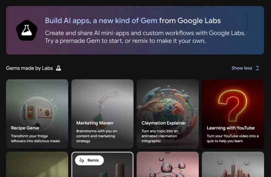 更新后的 Gems 管理器被清晰划分为两大区域:上半部分集中展示由 Google Labs 打造的官方 Gems,而下半部分则延续原有逻辑,用于管理用户个人创建或预构建的自定义 Gems。此前在独立 Opal 实验中出现的工作流,如今已作为预构建 Gems 直接呈现在 Labs 区域中。