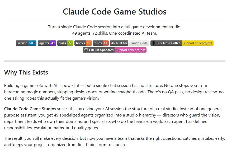 这个开源项目做的事情很有意思,叫做「把一个 Claude Code session 变成一家完整的游戏开发工作室」。