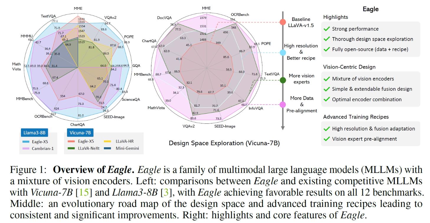 Eagle 的一个关键创新是能够处理高达 1024×1024 像素分辨率的图像,使得 AI 能够捕捉对光学字符识别(OCR)等任务的重要细节。Eagle 采用了多个专用的视觉编码器,每个编码器都针对不同的任务进行训练,如对象检测、文本识别和图像分割。通过结合这些不同的视觉“专家”,模型能够比依赖单一视觉组件的系统更全面地理解图像。