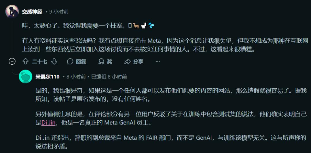 该消息一经曝光,迅速在网络上引发热议。众多网友纷纷参与讨论,其中关于在训练过程中使用测试集数据的行为是否属于欺诈成为争论焦点。有不少网友指出,基准测试的核心意义在于衡量模型对知识的泛化能力,也就是模型能否将所学知识应用到更广泛的场景中。如果模型只是单纯地记忆测试集的答案,那么这样的测试结果就无法真实反映其对知识的理解和应用水平,这种行为严重破坏了模型评估的公正性。例如,在机器学习领域,一个优秀的模型应该具备举一反三的能力,就像学生学习数学,不能仅仅死记硬背例题答案,而要真正理解数学原理,才能在遇到新的题目时正确解答。但也有部分网友对爆料内容持怀疑态度,他们认为Meta的“公司领导”大多是人工智能领域的先驱人物,在行业内拥有极高的声誉,不太可能为了追求基准测试分数而自毁前程,做出这种损害自身和公司声誉的行为。