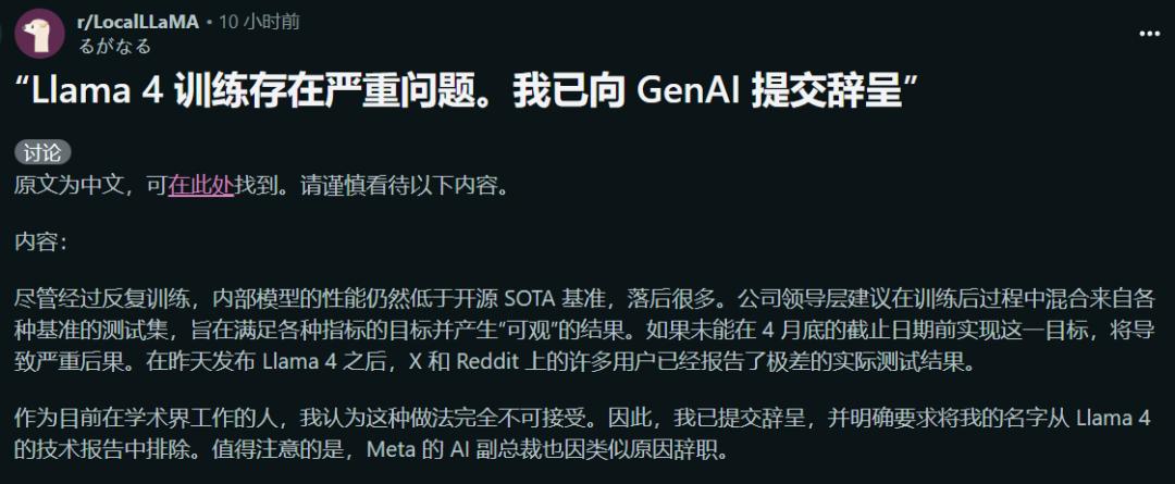 为了让Llama 4在各项指标上达到“能拿得出手”的结果,Meta领导提出在训练后期将多个基准测试集进行混合的方案。这种做法的目的是通过整合不同测试集的优势,使模型在各类评估指标上满足预期目标。并且,公司设定了4月底的严格期限,若无法在截止日期前达成目标,将会产生严重后果。然而,这种做法被发帖人认为是严重违反学术和行业规范的行为,作为学术界的一员,他对此深感不齿,因此选择提交辞职申请,并明确要求将自己的名字从Llama 4的技术报告中剔除。
