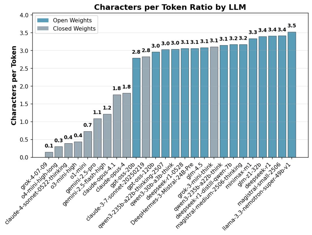为何差距如此之大?报告分析,闭源模型普遍采用“隐式思考”,即只向用户展示摘要或最终答案,而开源模型往往要输出完整的思考过程。研究通过字符与token的比例推断:OpenAI、Claude在聊天模式下仅给出30%的思考摘要,而DeepSeek、Qwen等开源模型则完整呈现100%思考链。
