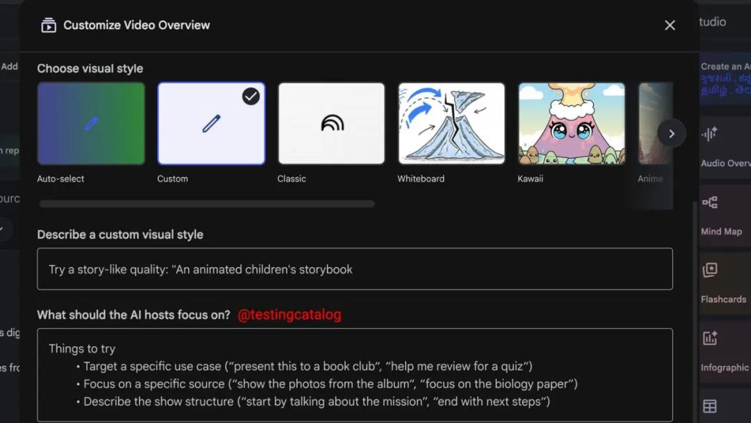 NotebookLM 的功能正在稳步扩展,未来,用户在生成视频时可以选择“自定义风格”,用自然语言指令去设定视频的整体视觉氛围。例如输入“像讲故事一样的画面”或“卡通绘本风”,系统就能据此生成相应的视觉效果。