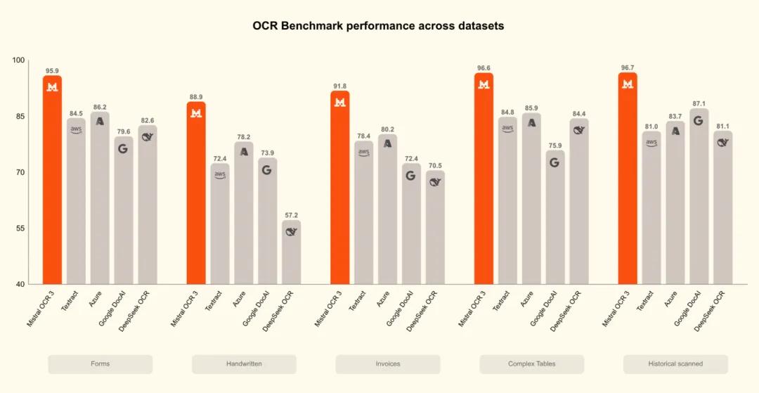 从官方公布的数据来看,OCR 3 在多类真实业务文档测试中,相较 Mistral OCR 2 和多家企业级 OCR 方案,整体胜率达到 74%。这类测试主要集中在低质量扫描件、表单、复杂表格以及手写内容,也是 OCR 最容易“翻车”的地方。