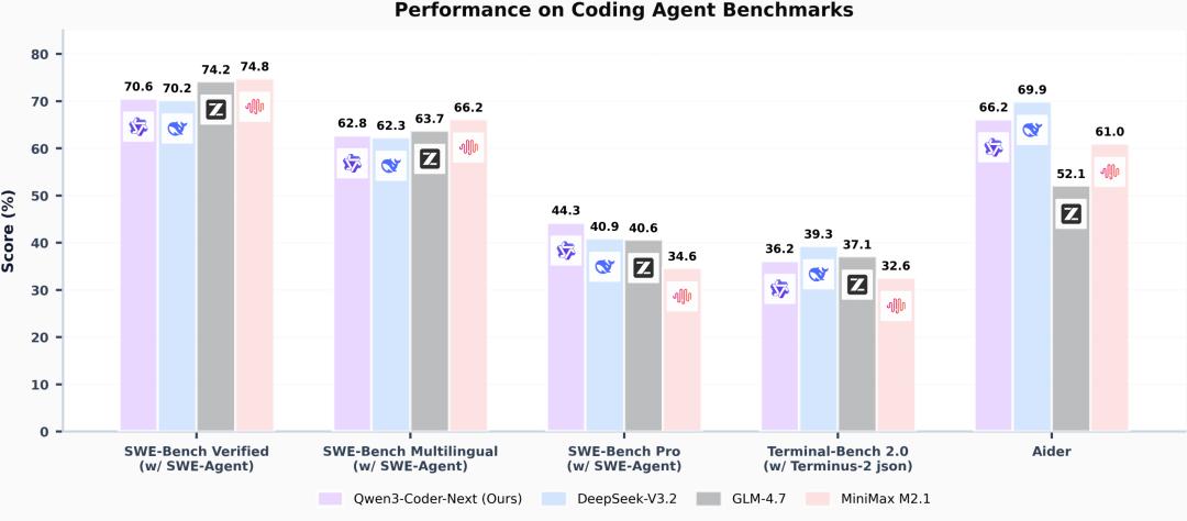 使用 SWE-Agent 框架时,Qwen3-Coder-Next 在 SWE-Bench Verified 上突破 70% ,这一数字在开源模型中属于第一梯队。