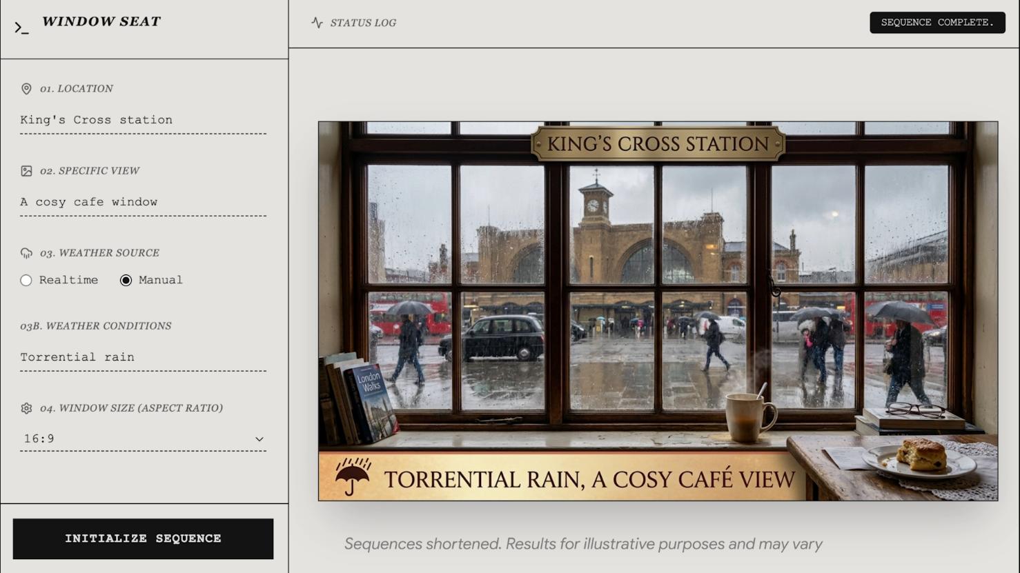 官方还做了一个 demo 叫 Window Seat,输入一个地点和实时天气数据,就能生成那个地点的窗景。