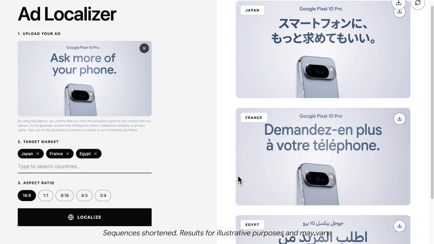 官方 demo "Global Ad Localizer" 展示了这个能力。输入一段英文广告,一键生成中文、日文、法文等多语言版本,而且图片中的文字和视觉风格都能保持一致。